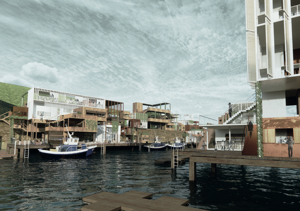 The fishery is built along the existing marina across both sides of the dock wall, connecting to the context through the waters where it supports 25 small trawlers and local businesses. Through a series of individual fishery models and shared amenities, a collective of curated spaces are designed in support of a sustainable and energy efficient fishery.